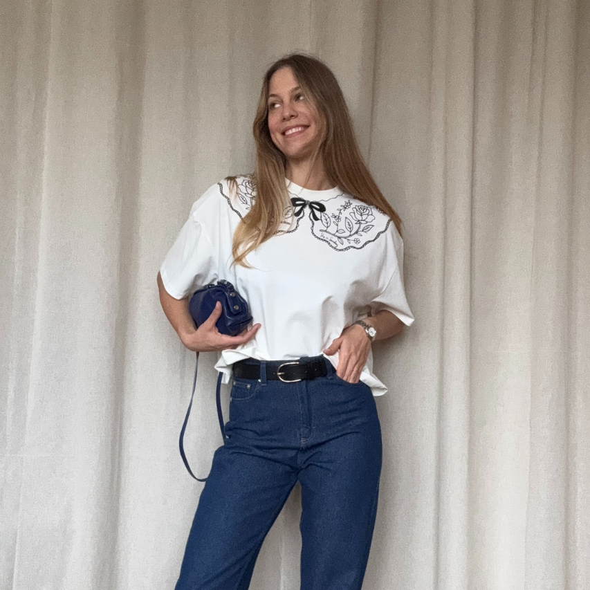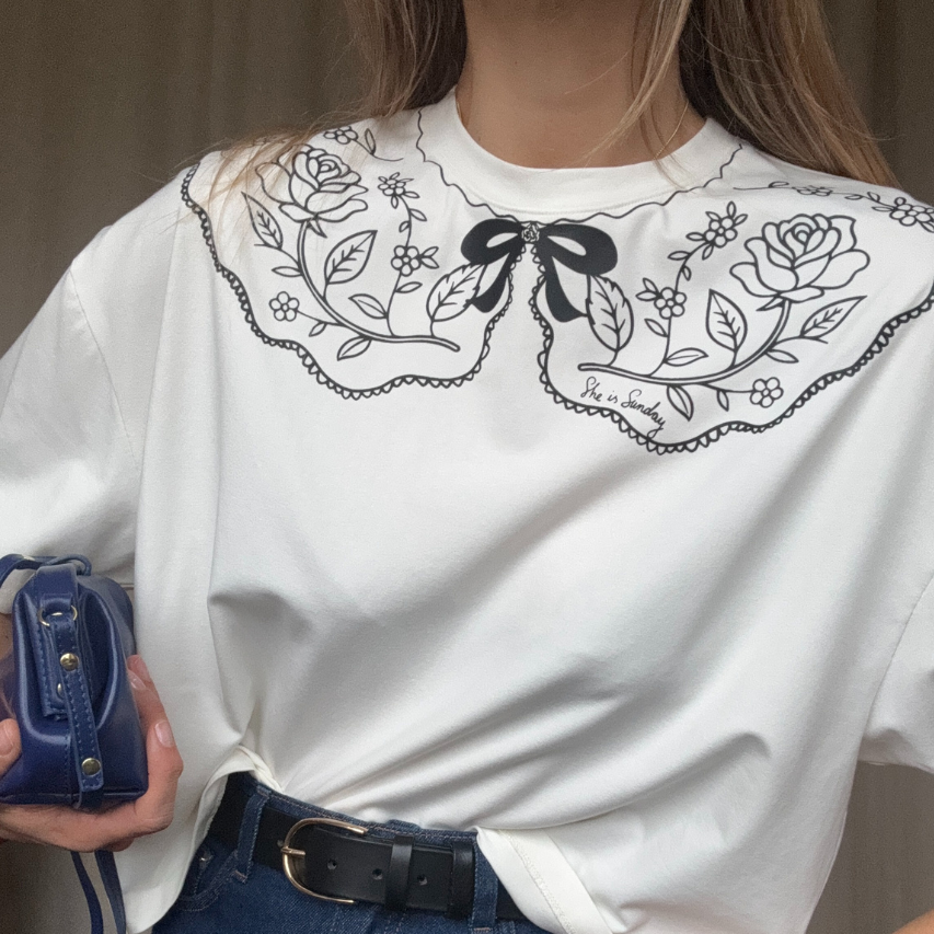 Autorski projekt grafiki powstał na bazie tych wspomnień: misternie rysowany kołnierzyk w róże i delikatne kwiaty wyglądaj jak haft wyjęty prosto z rodzinnej komody pełnej skarbów. Czarna ilustracja pięknie kontrastuje z klasyczną bielą T-shirtu, tworząc wzór romantyczny, a jednocześnie nowoczesny. Luźniejsza forma sprawia, że Aurora nosi się wygodnie, a przy tym wygląda wyjątkowo.
