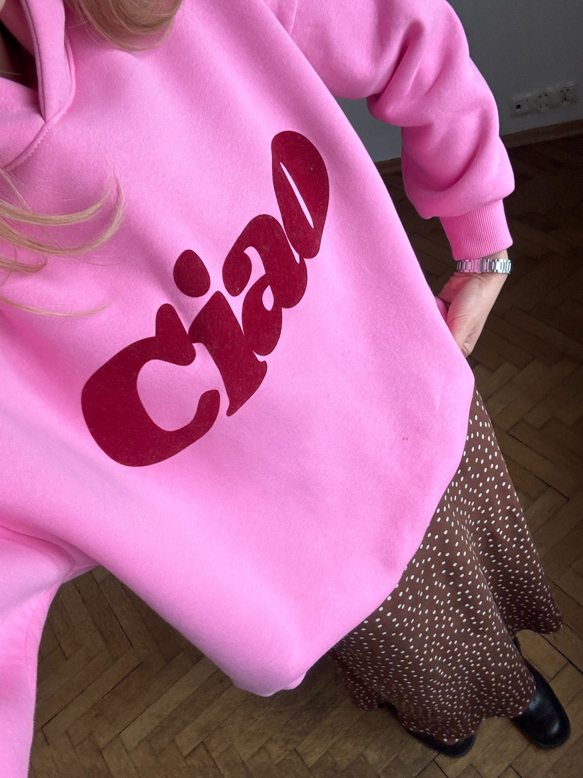 Poznaj naszą różową bluzę z kapturem Ciao Candy – połączenie stylu, ryzyka i włoskiego dolce vita na co dzień. Uszyta z wysokiej jakości bawełny z miękkim, drapowanym wykończeniem od wewnątrz (tzw. misio), otula wygodnym ciepłem i zapewnia komfort użytkowania od pory roku. Na przodzie znajduje się bordowy napis „CIAO” wykonany metodą flock, dzięki czemu ma on przyjemną, welurową strukturę i pozostałości. Obszerny kaptur zamykający bluzę i charakter, a brak kieszeni ograniczającej formę.