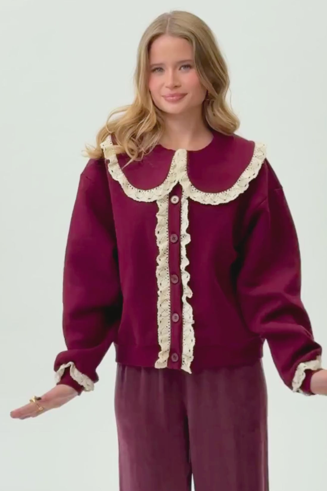 Bestsellerowy Kardigan Noelle powraca w nowym, głębokim odcieniu bordo! Charakterystyczny, duży kołnierz oraz listwa guzikowa wykończone misterną, kremową koronką nadają mu dziewczęcego uroku z nutą retro. Wykonany z mięsistej i niezwykle przyjemnej dla skóry dzianiny, Noelle to idealny towarzysz chłodniejszych dni, który zastąpi klasyczną bluzę czy lekki żakiet. To kardigan, który przyciąga spojrzenia i sprawia, że nawet najprostsza stylizacja nabiera wyjątkowego charakteru.