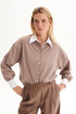 Koszula Haze w paski w odcieniach kawy z mlekiem to ukłon w stronę klasyki z nutą retro. Kontrastujący biały kołnierz i mankiety dodają jej elegancji, a prosty, lekko oversize’owy krój zapewnia wygodę. To model, który świetnie wpisuje się w styl Cinnamon Girl – minimalistyczny, a jednocześnie pełen charakteru. Na mankiecie znajduje się subtelny, haftowany napis „Ciao”, który dodaje całości włoskiego akcentu i wyjątkowego detalu.