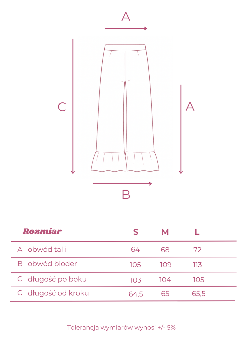 - Proste, szerokie nogawki zakończone efektowną falbaną