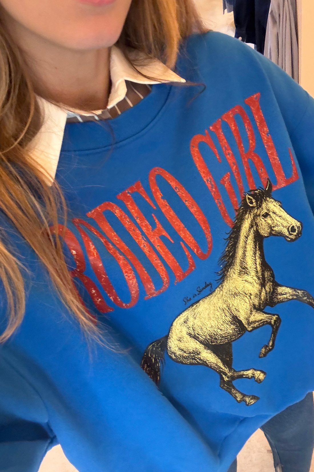 Bluza Rodeo w odcieniu nasyconego, kobaltowego błękitu to wyrazisty element, który zdefiniuje każdą Twoją stylizację. Centralnym punktem projektu jest nasza autorska grafika z galopującym koniem, która w połączeniu z vintage’owym napisem oddaje klimat bezkresnych prerii w nowoczesnym, miejskim wydaniu. Wykonana z grubiej dzianiny o luźnym kroju typu oversize, gwarantuje ciepło i absolutną swobodę ruchów.