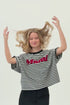 T-shirt Mami w klasyczne, czarno-białe paski to idealne tło dla wyrazistego napisu „Mami”, wykonanego miękkim, czerwonym flockiem o strukturze weluru. Nowoczesny krój boxy z obniżoną linią ramion zapewnia pełną swobodę i stylowy wygląd, a wysoka jakość bawełny gwarantuje, że pozostanie z Tobą na długo. To świeże spojrzenie na codzienny look każdej mamy, która chce czuć się wyjątkowo nie tylko od święta.