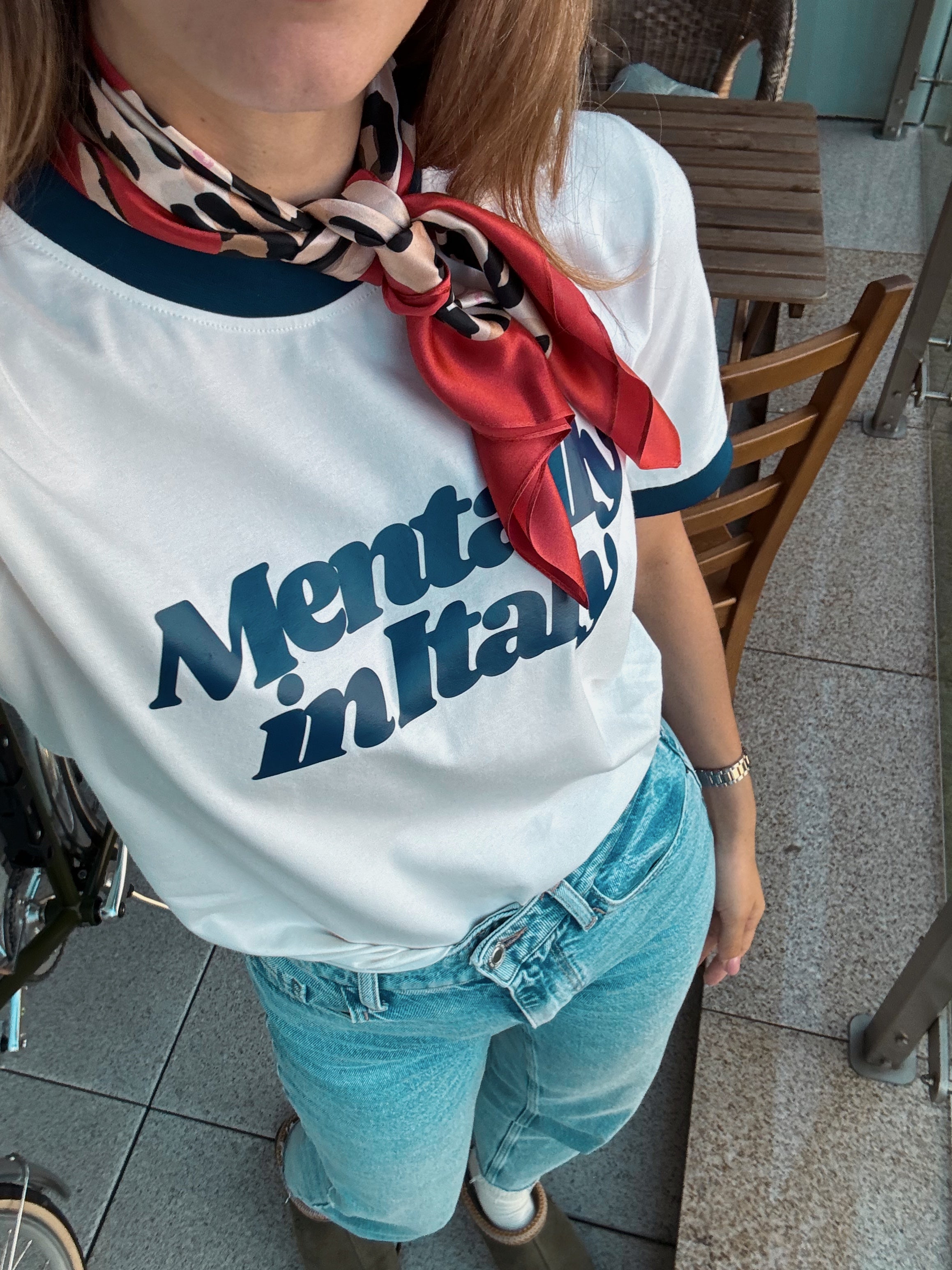 Klasyczny t-shirt MENTALLY IN ITALY w kolorze kremowym to idealne połączenie minimalizmu i stylu. Wykonany z miękkiej, wysokiej jakości bawełny, zapewnia komfort noszenia przez cały dzień. Granatowe ściągacze przy dekolcie i rękawach dodają mu wyrazistego, kontrastowego akcentu. Na przodzie znajduje się granatowy napis MENTALLY IN ITALY, wykonany techniką sitodruku, co zapewnia trwałość i wyrazistość detalu. To doskonała opcja dla tych, którzy cenią sobie klasyczny design z modnym, włoskim akcentem.