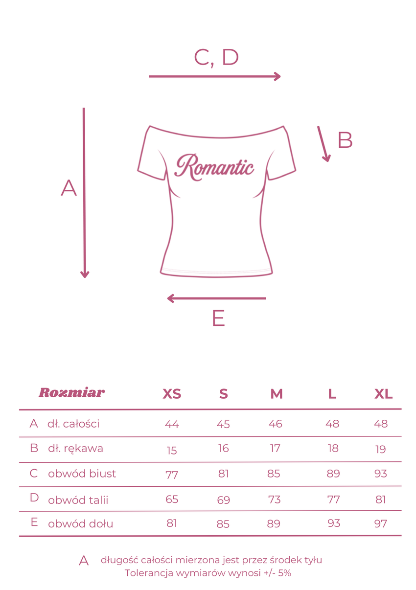 T-shirt Romantic to zupełnie nowy krój w naszej ofercie, stworzony z myślą o subtelnym eksponowaniu kobiecości. T-shirt wyróżnia się zmysłowym hiszpańskim dekoltem, który pięknie odsłania linię ramion i obojczyki, nadając stylizacji lekkości i elegancji. Głęboka czerń materiału stanowi doskonałe tło dla haftowanego napisu „Romantic”. Wykonany z miękkiej, elastycznej dzianiny, t-shirt świetnie dopasowuje się do sylwetki, gwarantując wygodę przez cały dzień. Zestaw go z ulubionymi jeansami lub spódnicą, by dodać swojemu lookowi wyjątkowego, romantycznego charakteru.