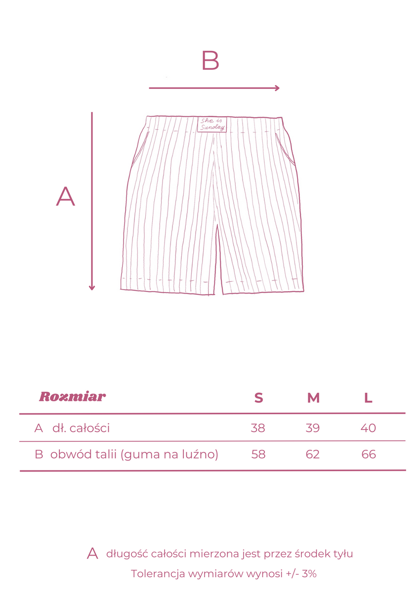 Szorty PANAMA to prawdziwy letni must-have – uszyte z lekkiego materiału, w klasyczne niebieskie paski z uroczym cytrynowym twistem. Mają kieszenie po bokach, są wygodne i praktyczne – łatwo się je pierze i prasuje, więc idealnie wpisują się w styl easy going. Na środku z przodu znajduje się charakterystyczna metka She is Sunday.