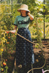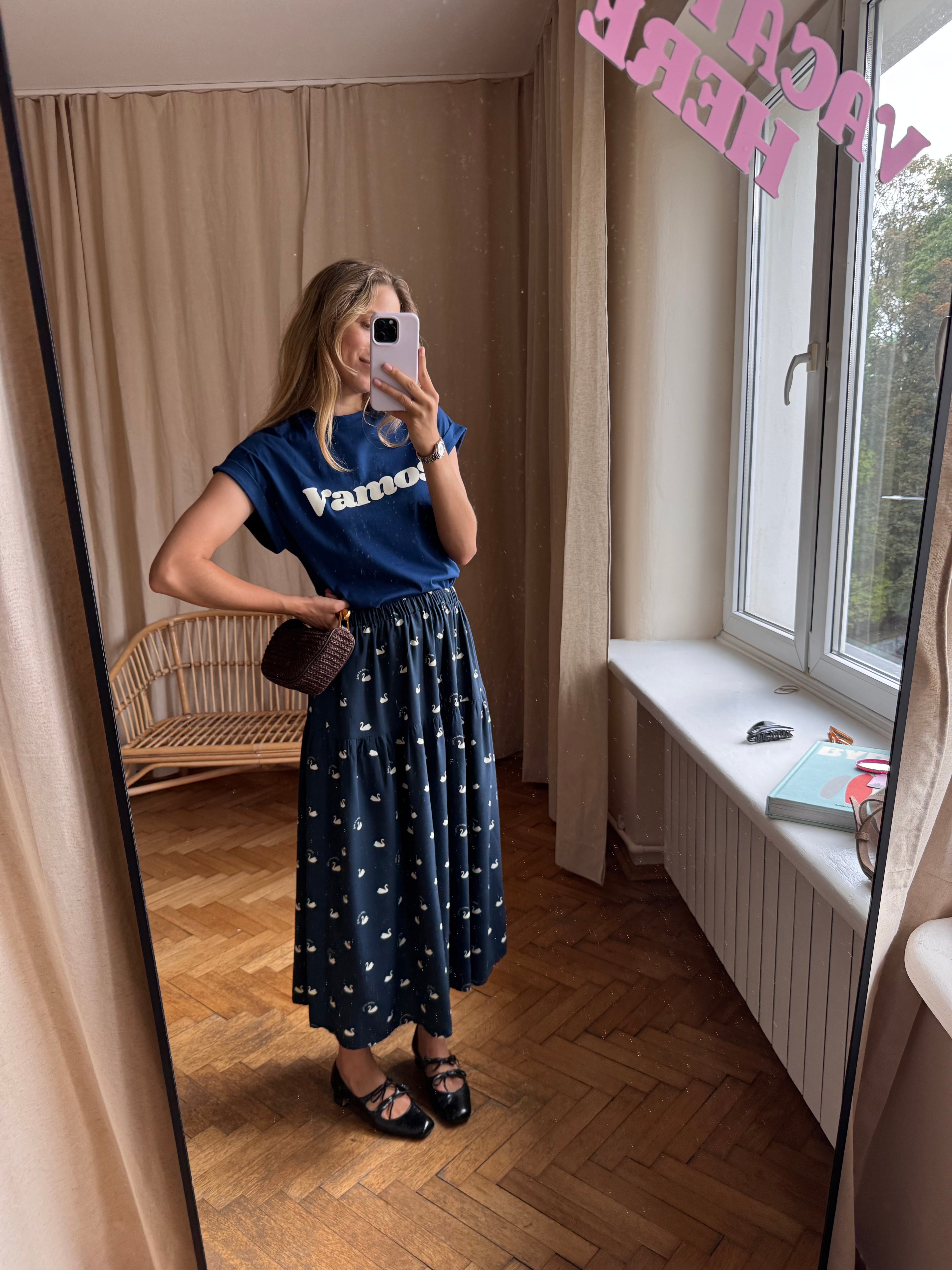 Spódnica Selva Cigno Blu to długa spódnica, która przenosi myślami nad ciche jezioro o świcie. Nasz autorski print z łabędziami to opowieść o łagodności, wolności i kobiecym spokoju. Głęboki granat tkaniny dodaje jej elegancji i sprawia, że równie dobrze sprawdzi się w codziennych stylizacjach, jak i tych bardziej wyjątkowych. Rozkloszowany krój porusza się lekko przy każdym kroku, a wysoki stan z gumką dba o wygodę bez rezygnacji ze stylu. W duecie z miękkim T-shirtem lub swetrem z tej samej kolekcji tworzy harmonijną całość – jak dzień spędzony w domku pośród zieleni.
