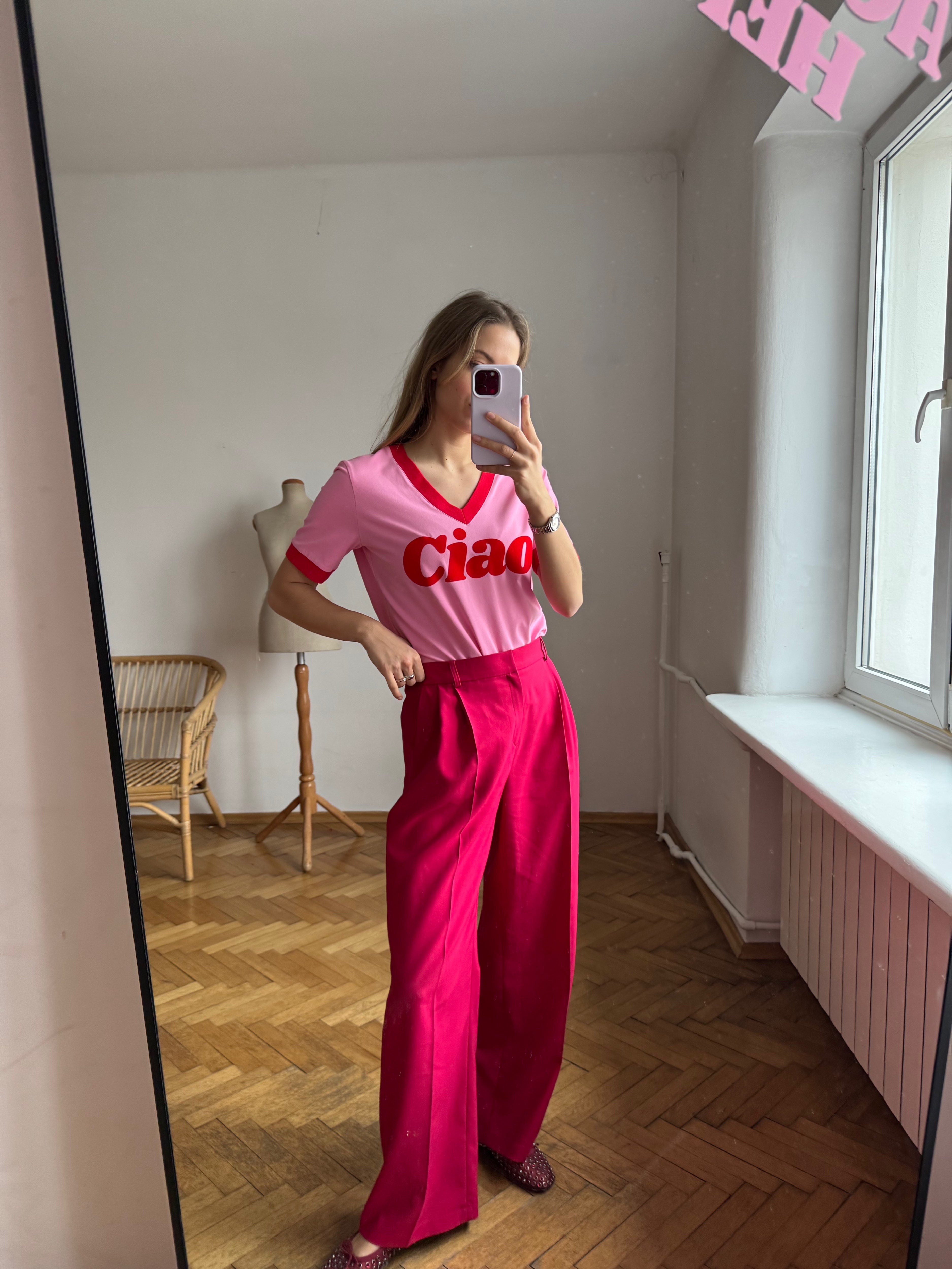 Czerwono-różowy T-shirt z dekoltem w serek (v-neck) to nasza bestsellerowa propozycja, która łączy w sobie elegancję z odrobiną luzu. Na przodzie koszulki widnieje wyrazisty, czerwony napis „Ciao”, który nadaje całości nowoczesnego i swobodnego charakteru. Wykonany z miękkiej, komfortowej dzianiny, ten T-shirt zapewnia wygodę noszenia przez cały dzień. Nasz ulubiony, czerwono-różowy kolor dodaje mu energii i wyróżnia go spośród innych modeli. Idealny do codziennych, casualowych stylizacji, ale równie świetny w bardziej eleganckich zestawieniach.