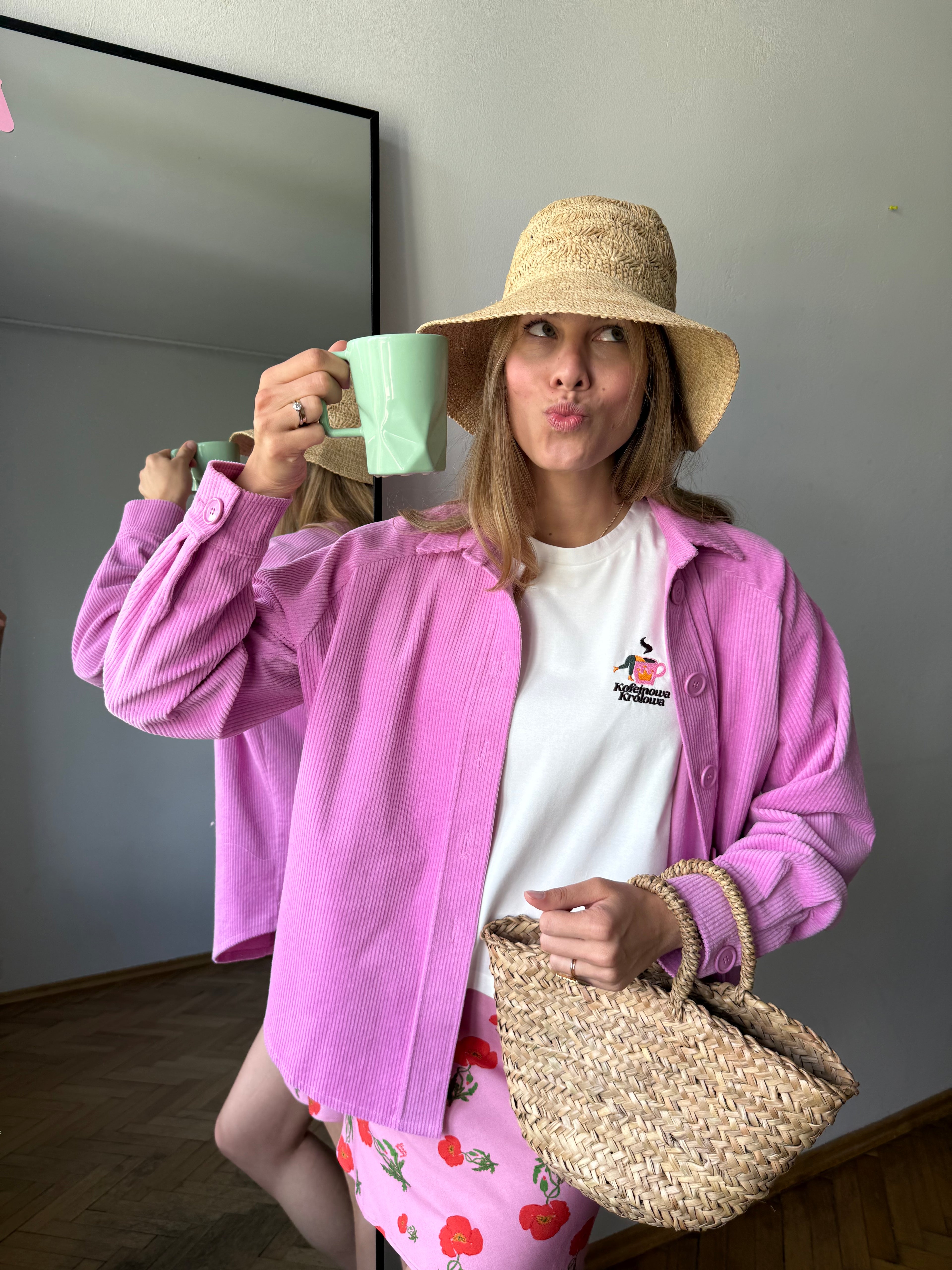 T-shirt COFFEE QUEEN to idealna propozycja dla tych, którzy wolą subtelniejsze formy wyrazu. Zamiast dużych nadruków – haft, który mówi wszystko. Napis "Kofeinowa Królowa" i urocza grafika babeczki wpadającej do filiżanki kawy to pełne charakteru, ale nienachalne połączenie, które doda stylu każdej stylizacji. To delikatniejsza i bardziej wysmakowana odsłona codziennego T-shirtu – idealna dla tych, którzy wolą minimalizm.