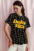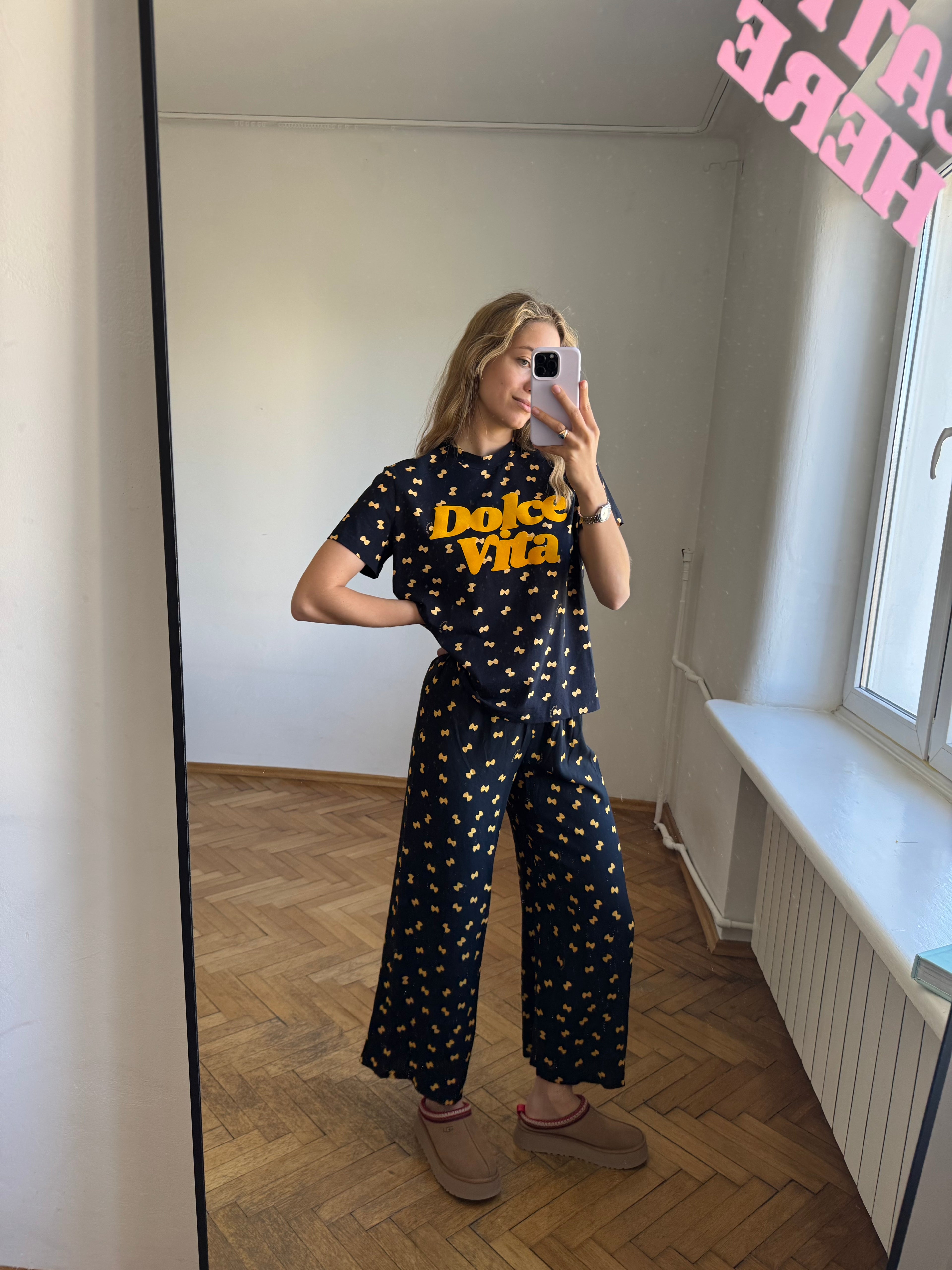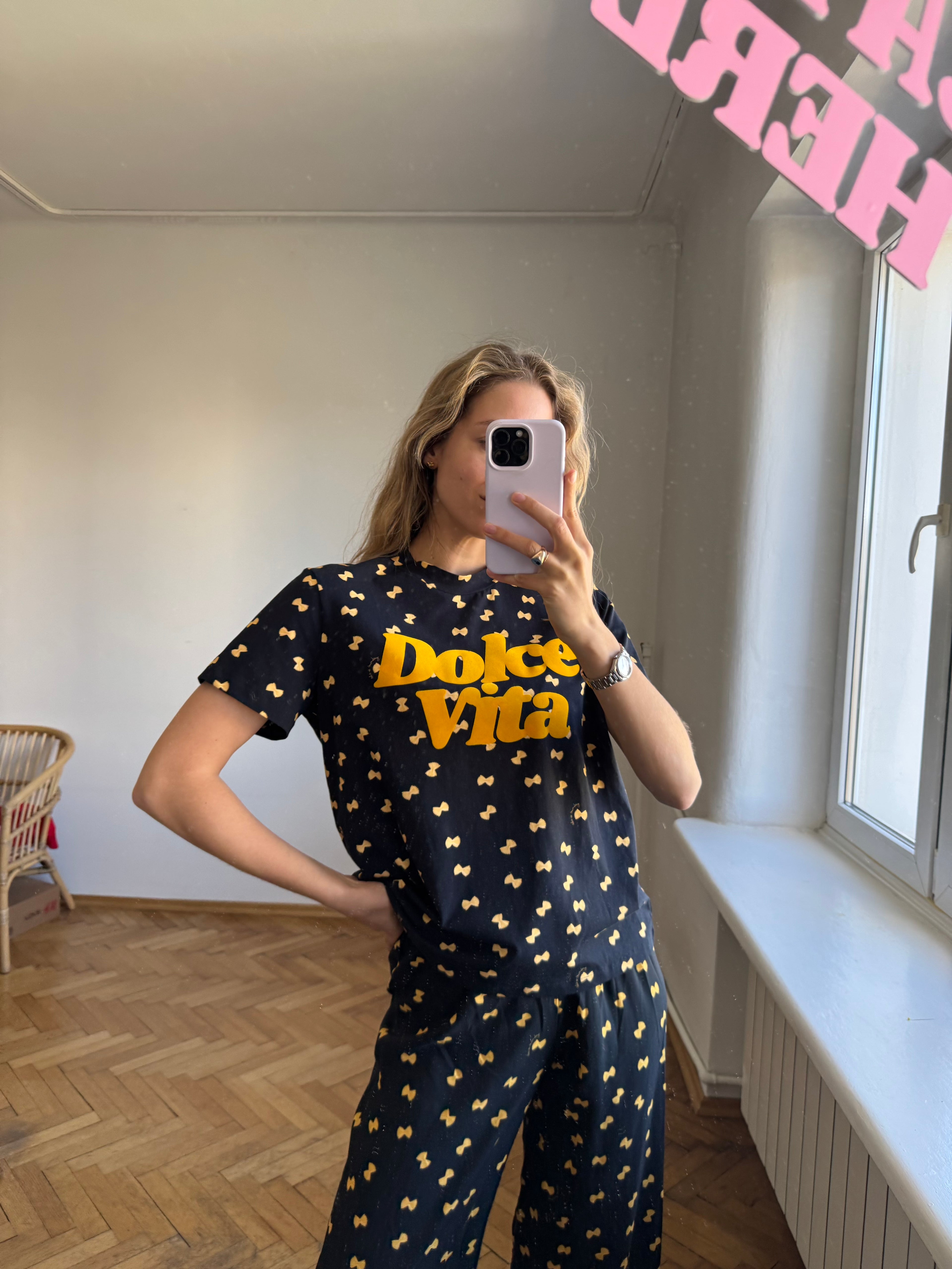 T-shirt FARFALLE to kwintesencja włoskiego stylu i radości życia. Granatowa baza ozdobiona jest złotymi wzorami makaronu w kształcie kokardek (farfalle), które nadają całości niepowtarzalnego charakteru. Duży, kontrastowy napis Dolce Vita w intensywnym odcieniu żółci przyciąga uwagę i nadaje energii. Idealny do jeansów, spodni z wysokim stanem czy spódnic – sprawdzi się zarówno w casualowych, jak i bardziej wyrazistych stylizacjach.
