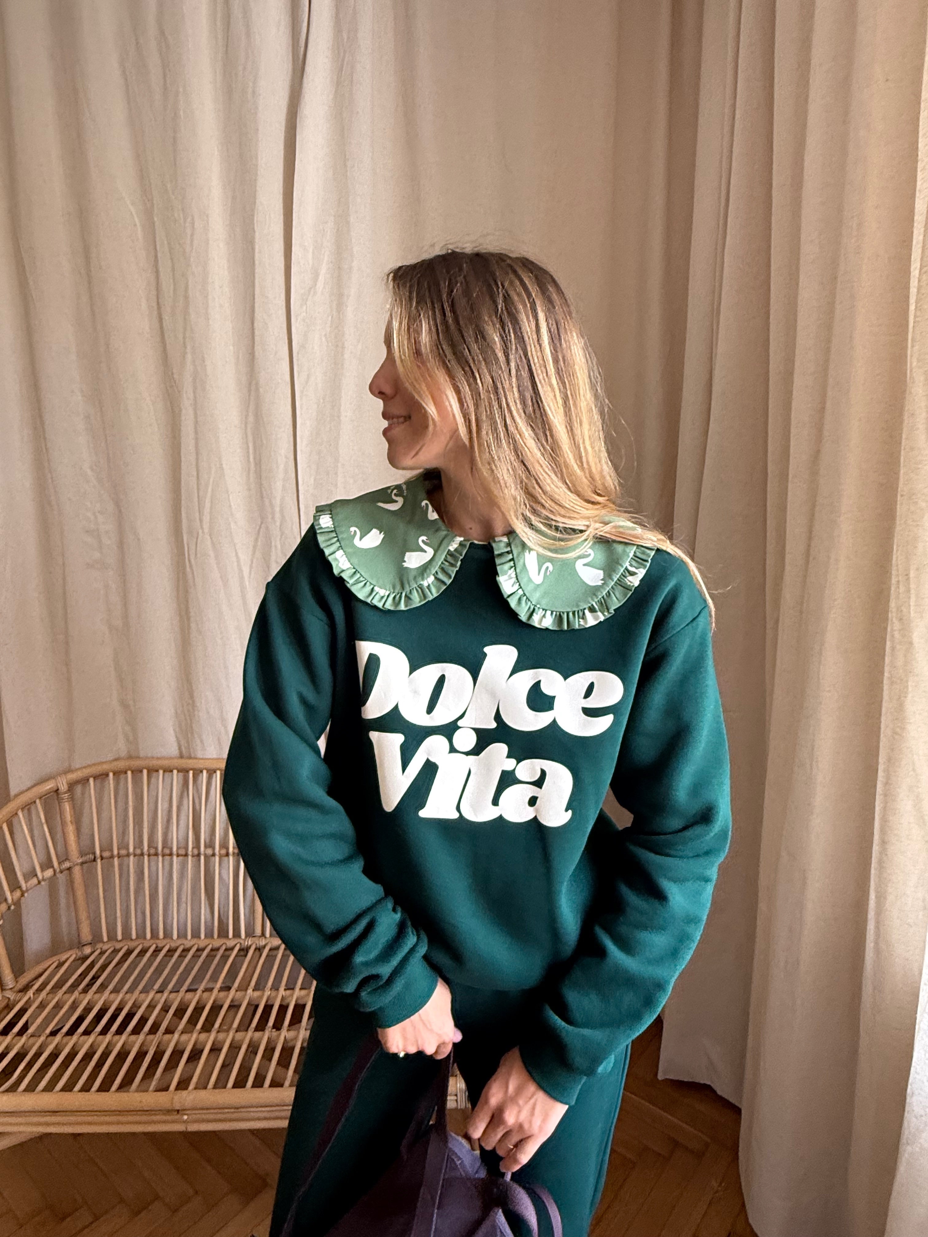 Bluza Dolce Vita Leśna powstała z potrzeby chwili oddechu – zaprojektowana z myślą o porankach pachnących kawą, chłodnych spacerach po lesie i cichym celebrowaniu codziennych rytuałów. Jej głęboki, leśny odcień symbolizuje ukojenie, kontakt z naturą i wewnętrzną równowagę. To kolor, który wycisza, otula i dodaje siły – dokładnie tak, jak las. Napis “Dolce Vita”, umieszczony z przodu w kremowym kolorze, przypomina o tym, co najważniejsze: że szczęście często kryje się w prostych rzeczach.