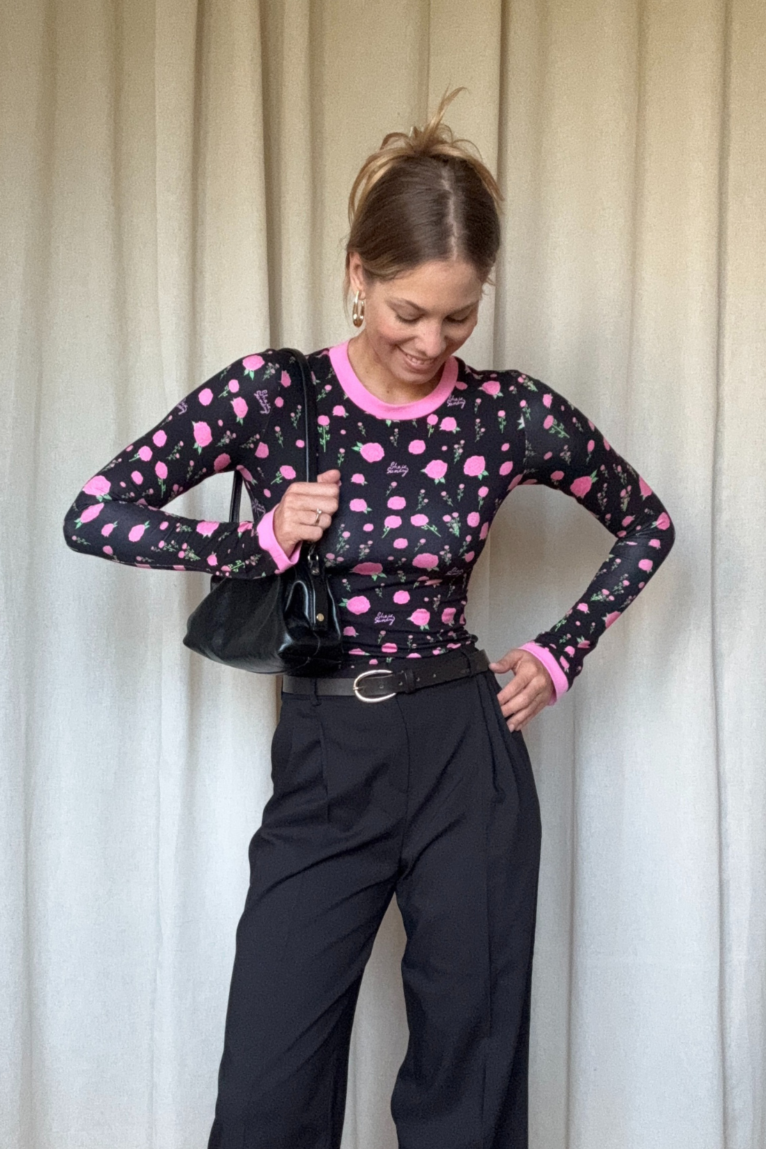 Gdy poranki stają się chłodniejsze, a dni coraz krótsze – longsleeve wraca na pierwszy plan. Rosa Feroce to idealny model na przełom sezonów: uszyty z miękkiej dzianiny, z naszymi ikonicznymi różowymi wykończeniami - otula sylwetkę, nie rezygnując z wyrazistego charakteru. Autorski print w drobne róże i pąki wprowadza romantyczny klimat z delikatnym pazurem – czarne tło dodaje mu głębi i sprawia, że z łatwością odnajdzie się w jesienno-zimowej garderobie. To model, który możesz nosić przez cały dzień – od porannego cappuccino po wieczorne wino z przyjaciółką.