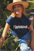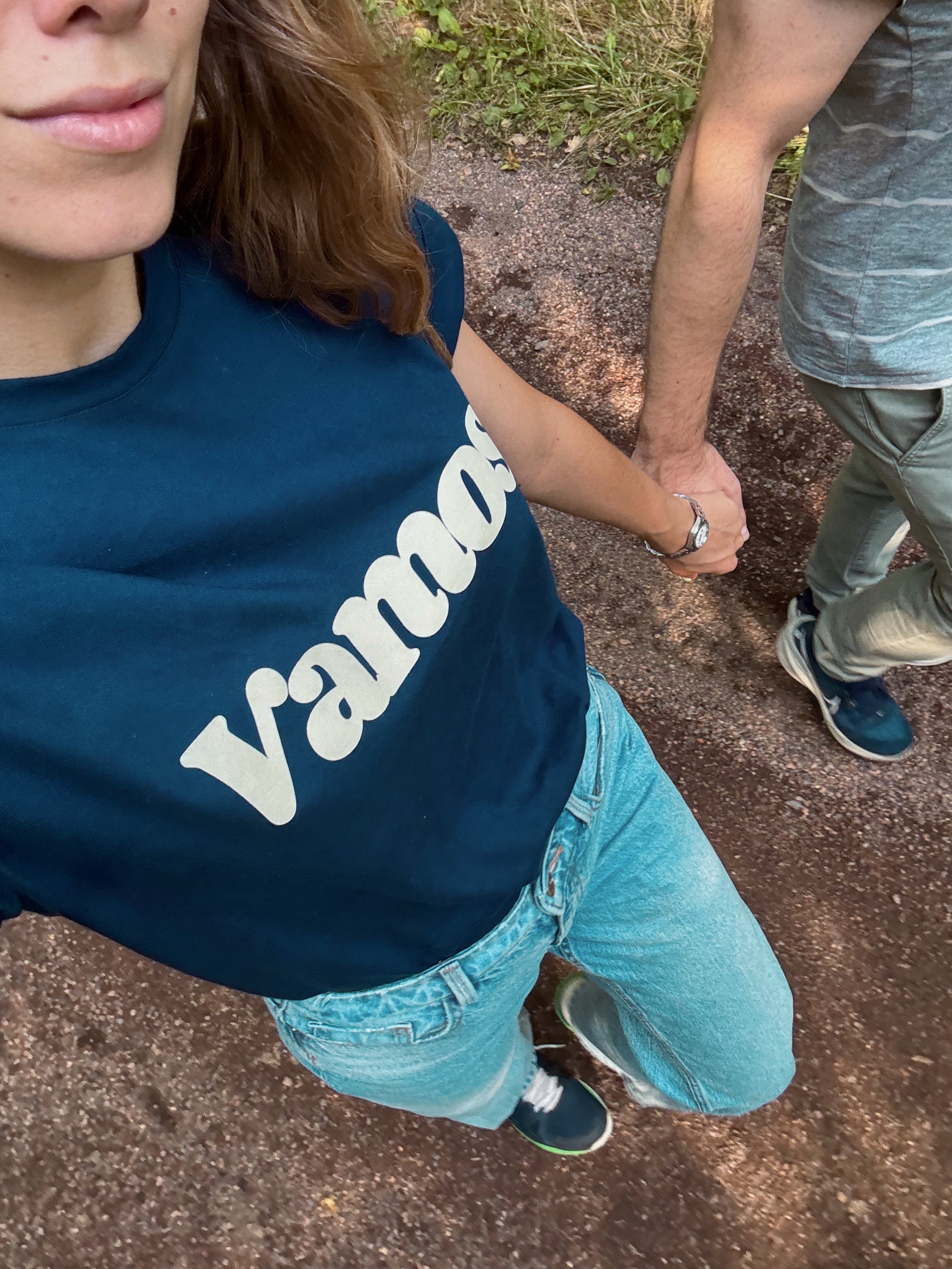 T-shirt Vamos o głębokim granatowy kolorze- przyciąga uwagę i dodaje energii. Idealnie sprawdzi się na spacer czy każdą inną aktywność sportową! Kremowy napis "VAMOS" nadaje t-shirtowi charakteru i hiszpańskiego uroku.