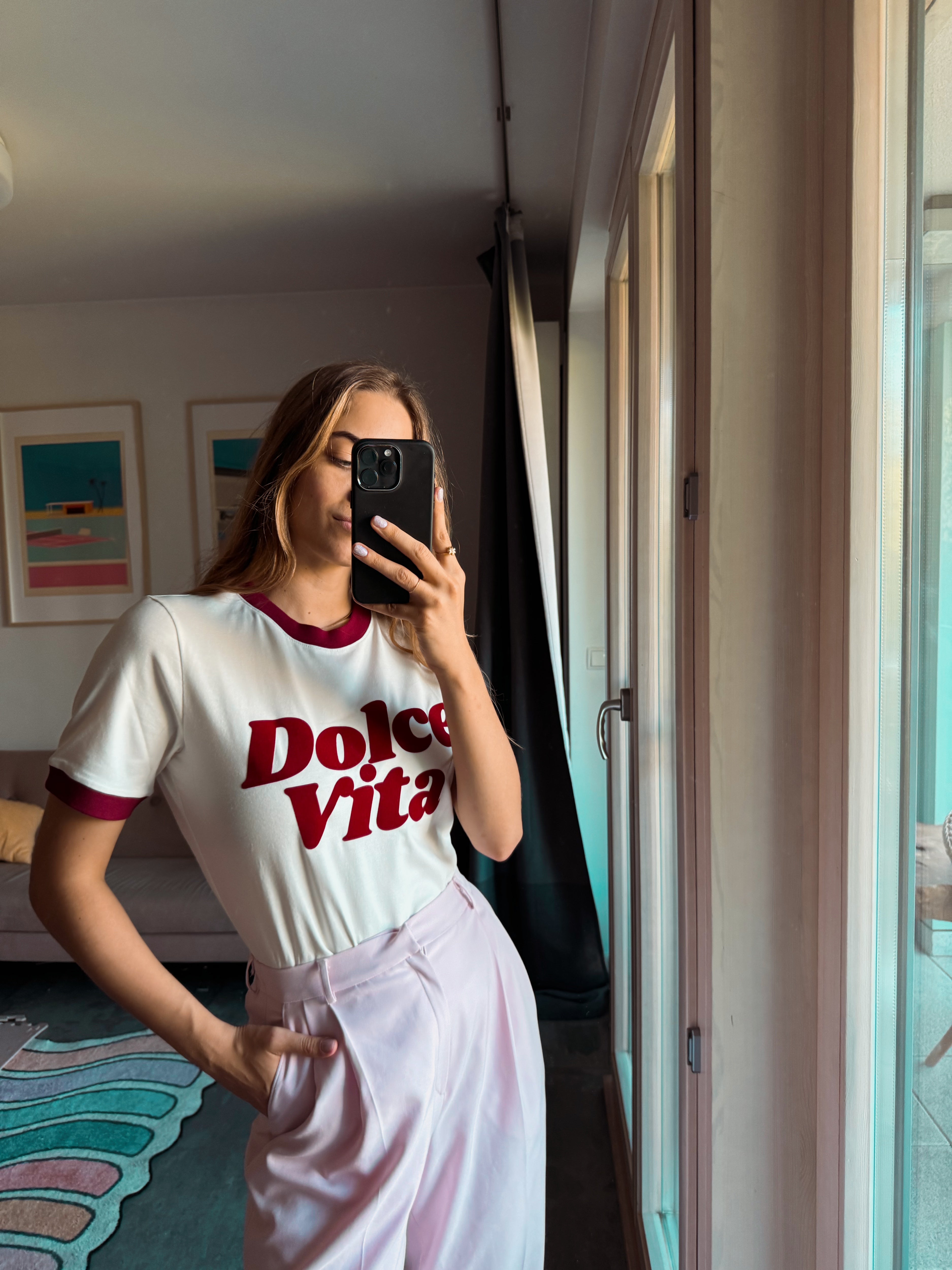 Zachwyć się naszymi T-shirtem "Dolce Vita", który łączy w sobie elegancję i romantyzm. Jego kremowy kolor kontrastuje z bordowymi ściągaczami, nadając wyjątkowy charakter. Welurowy nadruk "Dolce Vita" subtelnie podkreśla luksusowy i romantyczny styl. Idealny na każdą okazję, od romantycznych wieczorów po spotkania z przyjaciółmi.