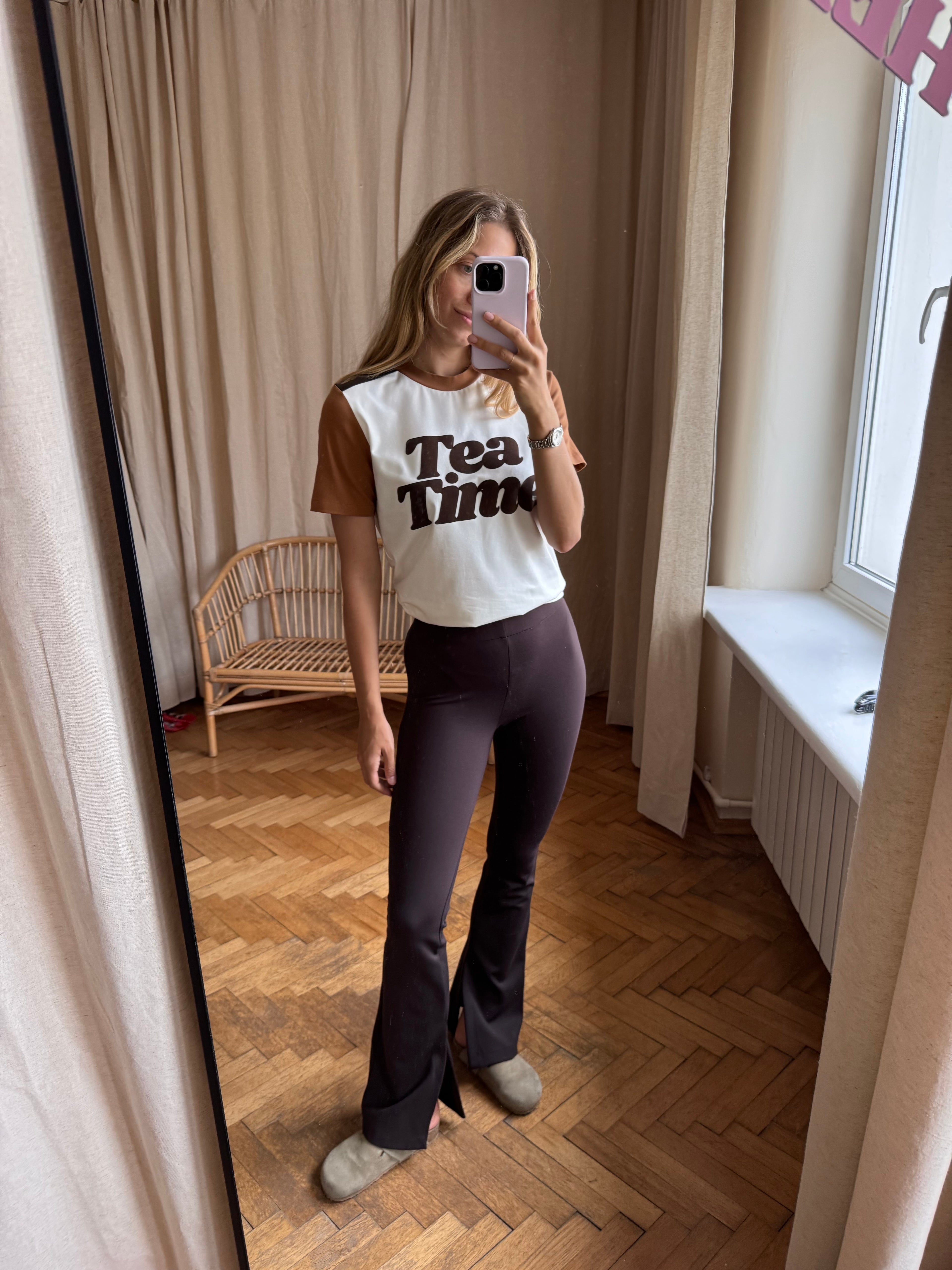 Czas na herbatkę, czyli... moment tylko dla siebie. Ten kremowy t-shirt z kontrastowymi rękawami i nadrukiem „Tea Time” ma w sobie retro vibe i domową przytulność. Wygodny fason, naturalna bawełna i delikatna kolorystyka sprawiają, że z łatwością połączysz go z ulubionymi jeansami, spódnicą lub narzuconym kardiganem. Dla fanek stylu slow – i herbaty oczywiście.